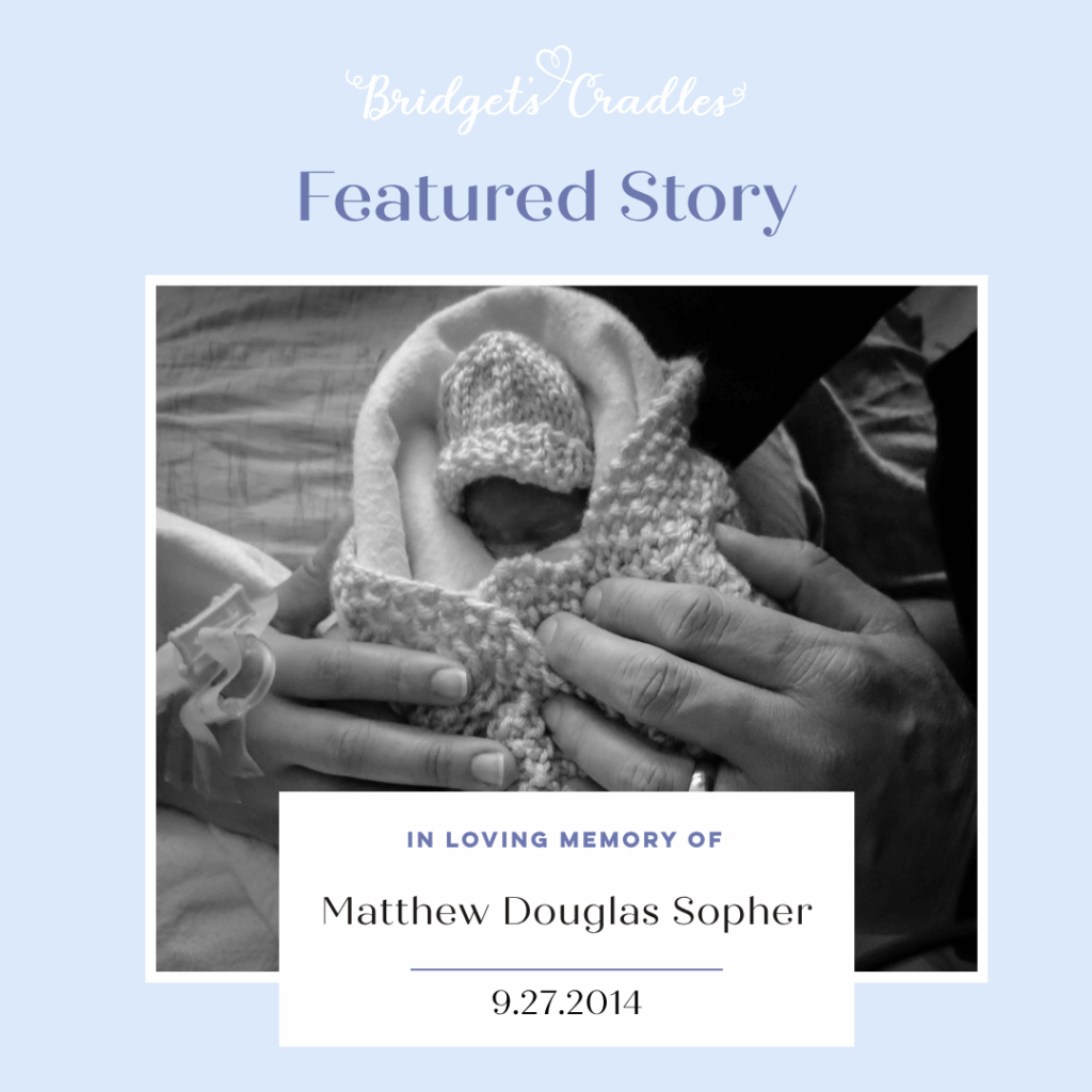 In 2015, I found Bridget’s Cradles. Bridget’s Cradles has allowed me to take my grief and turn it into something positive that will help others. I have become a regional coordinator, helping to link hospitals with the organization and recruit volunteers. I am proud to say that thanks to the work of Ashley and Bridget’s Cradles and the help of volunteers around the country, St. Francis, where Matthew was born, now has cradles to hold other babies born too soon. My prayer is that the families who receive the cradles can feel a tiny bit of peace from knowing there are others who are with them during the most difficult time in their lives.