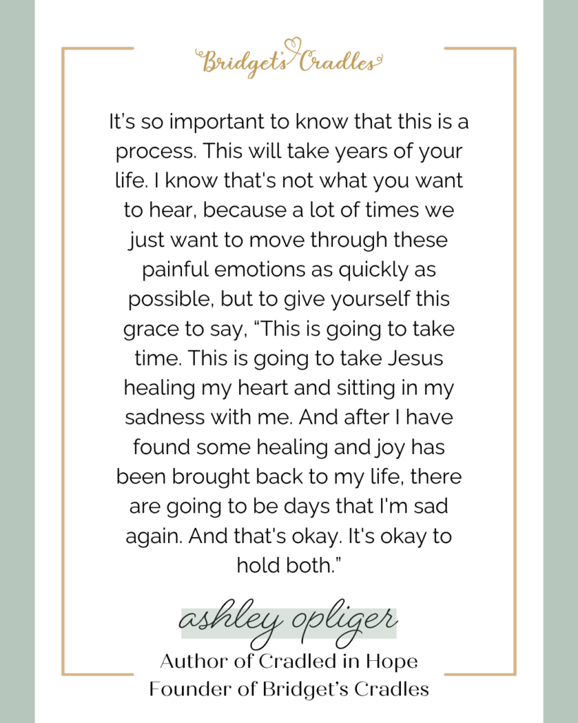 To stay connected with us and receive faith-filled encouragement, follow us on Facebook and Instagram at @bridgetscradles, @cradledinhope, and my personal page @ashleyopliger.
