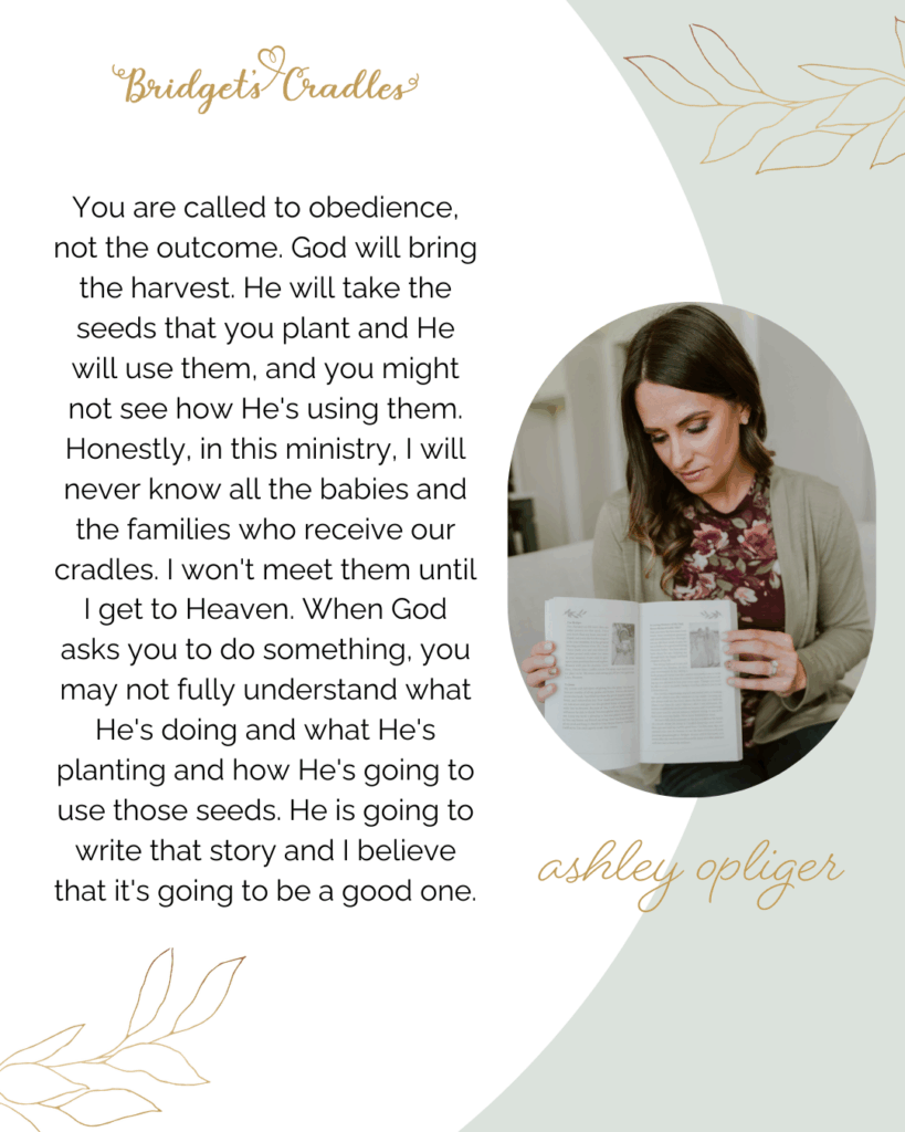 To stay connected with us and receive faith-filled encouragement, follow us on Facebook and Instagram at @bridgetscradles, @cradledinhope, and my personal page @ashleyopliger.